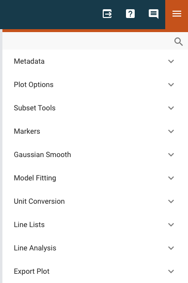 Any spectra generated by plugins (e.g., Gaussian Smooth) will be automatically displayed in the spectral viewer. These spectra, and any other that is available, can be found in the data selection dropdown menu (see Selecting Data Set for more detail) where you can also toggle their visibility. This functionality is also available through the Python API.